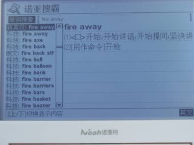 刘新看不懂这样两句话,“I have a few questions.” “Fire away.” fire是“火;燃烧的东西”的意思,可是在这里不能翻译成“火…”并且fire away合起来是什么意思呢?他在诺亚舟的ND550词典机里输入词组“fire away”,屏幕立刻显示出新英汉词典的翻译:开始;开始讲话;开始提问,还有科技词典的翻译:不停地射击……一目了然,上面两句话就翻译为:“我有几个问题。”“请提问吧。”刘新点点头说:“俩字儿,神奇”。