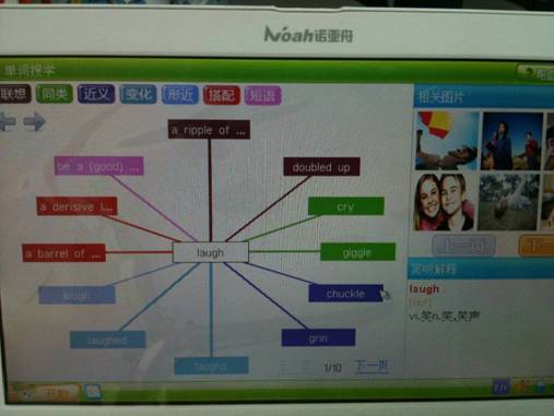 可是这么多单词都把我给看晕了,究竟是什么意思呢?身边的姨妈提醒我手里不就捧着诺亚舟的NP5800,什么单词查不到啊,真是骑驴找驴。我恍然大悟,赶紧先查查laugh是什么意思。咦,怎么出来了红红绿绿的那么多单词啊,还有图片。姨妈帮我解释,原来这是NP5800的“万维搜学”,查一个单词能显示出与之相关的至少十个单词或词组,包括联想词、近义词、同类词、搭配词等等,这样的扩展学习足以抵得过十万个为什么了。