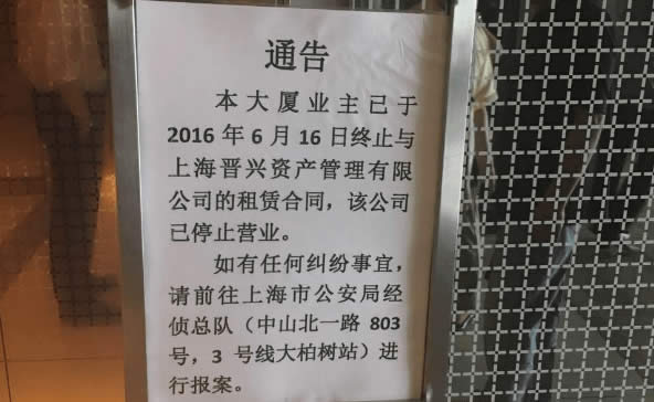 继中晋、快鹿之后,沪上另一家大型资管公司“晋兴资产”陷入兑付危机。自上周五消息曝光以来,昨天又有大批投资者聚集到晋兴讨说法,其公司所在地的高档商场大门亦被殃及,一度遭到围堵。目前,尚未兑付的投资人约2000余人,未兑付金额达4亿余元。 涉及投资者2516人4.32亿尚未兑付 上海晋兴资产管理有限公司周五被曝面临资金流动性问题。据该公司的客户和员工称,上周晋兴资产没有按时兑付。 几名员工称,晋兴资产总裁王冕本周本该出现在公司审批付款,但他没有现身,也联络不上。此后,晋兴公司财务季某、法人严某、销售主管李某已向公安机关报案,称其公司实际控制人王冕将公司约1.6亿元资金划转后逃逸,造成公司资金断链。 记者了解到,晋兴资产主要销售由贷款打包的理财产品,目前尚不清楚该公司的筹资规模。王冕在2014年注册了晋兴资产,注册资本金1亿元人民币。不过,几个月后王冕就不再担任法人代表。 如今,尚未兑付的投资人涉及约2516人,未兑付金额达4.32亿元,公司账户已被冻结。但根据《晋兴资产兑付公告》显示,目前在财务数据还没有完全核查清楚的情况下,晋兴资产债权仅包括平安创科5000万和缪先瑞1600万,账面现金仅仅424万。 在晋兴资产陷入混乱之前,上海已经至少有其他两家大型公司倒闭,即中晋资产管理和上海快鹿投资集团。 事发后数名高管似被投资人围困4天 晋兴资产官网显示其办公地点在上海市淮海中路环贸广场二期,公司口号是“成功之道,源于尽心”。 昨天记者赶到环贸广场时看到,该商场大门前就有不少投资者冒雨席地而坐,商场面向陕西南路的入口本设有两道各四扇的玻璃门,但现在每道的其中两扇已被临时卸走,数名安保人员在原地待命。 走进商场一楼,一眼便见到里外三层聚拢在一起的投资者正商议追讨方法,周围有商场顾客及销售人员也驻足旁观,动静不小。 有投资者和安保人员告诉记者,上午时,不少投资者想进入晋兴位于商场二期20、21层的办公地,却遭到物业方面一再阻拦。于是有情绪激动的投资者索性共同将商场陕西南路大门堵死,不让其他顾客进入。在僵持一段时间后,物业方面才允许投资者自由进出晋兴办公室。 记者在现场看到,翻倒的桌椅、跌落的电脑、散乱在地的各种资料、被翻箱倒柜的“总裁办公室”,晋兴办公地目前早已是一片狼藉,但即便如此,不难看出这2000多平米的超大办公室原本的排场之大、装修之精,与中晋、快鹿相比有过之无不及。 “到现在一直断水断电,连厕所也不开放,想赶我们走。”数名投资者告诉记者,事发后,晋兴包括财务总监季某、法人严某等几位高管被投资者围困在办公室,以防他们逃跑,有不少投资者驻留办公室“看管盯梢”。而由于气温较高,现场投资者对于物业断水、断电、不开放厕所的举动十分不满。 据一位物业人员表示,几位高管已被困4天,但“也许因为心虚,他们一直没有报案。”截至记者离开现场时,已有警方等其他相关部门人员前来与几位高管谈话。 员工称老板丧心病狂:“保洁阿姨也投了10万” 记者看到,晋兴资产的一本宣传册对供应链管理等行业的高收益投资进行了大量吹捧,且其中印着一些全球大型金融、法律及风险合规公司的标志,并称这些公司都是战略合作伙伴。 另外,晋兴资产承诺为到访其办公室的人提供免费的地铁卡。据公司网站显示,去年6月该公司在一个五星级酒店举行了投资者答谢会,有600多名投资者参加,会上王冕还抽取了幸运客户,奖品包括黄金及日本豪华七日游。 现场,95%的投资人均为中老年人。有六旬老者号啕痛哭,称其丈夫及儿子均为残疾人,用来投资的钱是仅有的买房的希望。 一位晋兴业务员直接控诉,“我们老板简直丧心病狂。”他告诉记者,不仅自己作为内部员工被忽悠投资了40万元,连公司二楼层面的一位保洁阿姨也被骗投了10万元。 有消息称,晋兴资产内部关系颇为复杂,此次牵连的人物众多。 有媒体报道,王冕和缪氏集团缪先瑞是晋兴的两位实际控制人,各自拥有50%的股份,此二人各派了两人成为公司高管,四人任副总裁分管人事、销售、财务、企划四个部门。 公司日常运作基本由财务总监季某具体处理,王冕下达指令,通过拆东墙补西墙的方式进行资金运转。公司除平安、海航部分项目是真实债权投资外,其他项目均为伪造。 媒体称季某曾亲口承认,缪氏集团提供一部特制手机,此电话只能接听缪先瑞的来电,其一切行为都是受缪氏操控。缪氏在上海是家族企业,后台背景实力强大,在环球金融中心69楼、五角场万达广场等有大量写字楼业务。